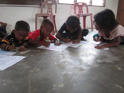 Teaching village kids how to count to 10 in English and the colors of the rainbow.
