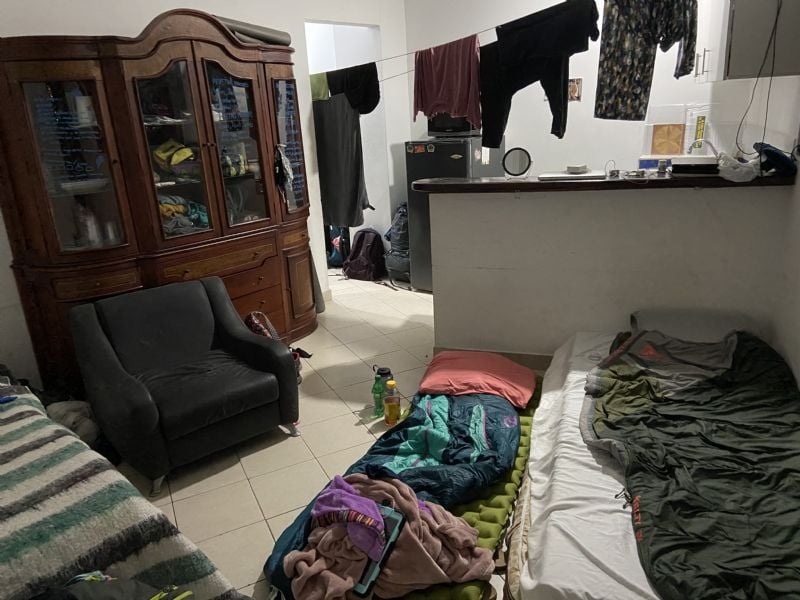 We’ve been in Colombia for 3 weeks now. It’s very different from the farm in Costa Rica. We have 12 girls staying in an apartment with 2 bedrooms and one bathroom. There are 2 sets of 3 bunks in one room and 1 in the other. That leaves 3 of us to sleep in the living room. There is one bed in there and 2 other mattresses. We don’t really have room to leave out both mattresses on the floor all day, and I decided not to use either one. They are stacked on one side of the room to make a slightly higher bed. That leaves me sleeping on my sleeping pad and sleeping bag.