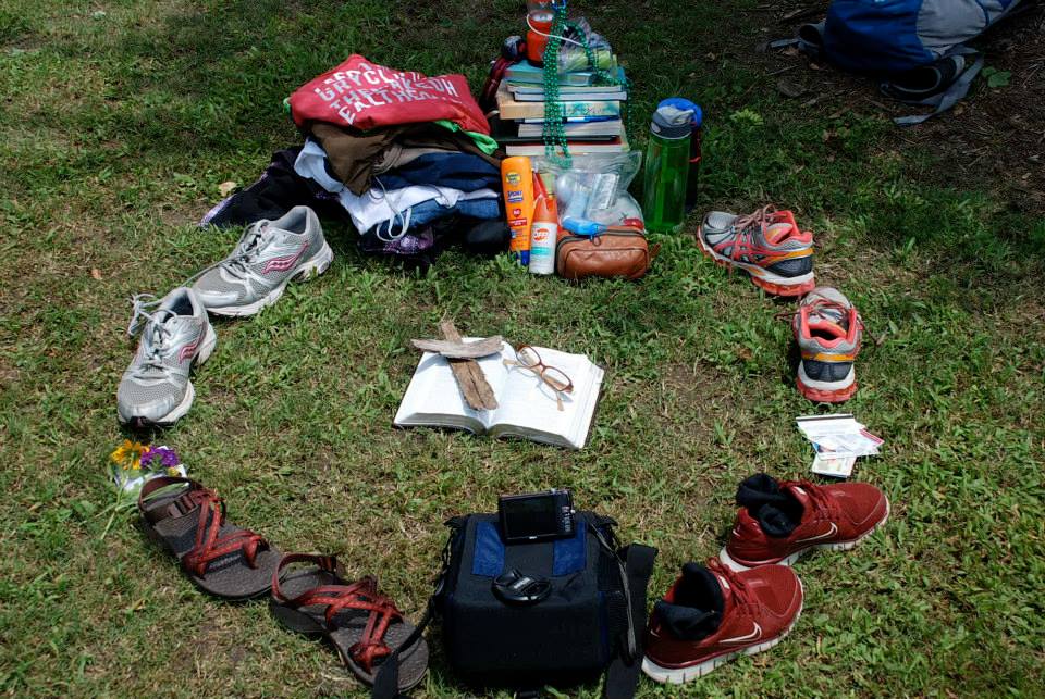 Our story begins on the right in the middle of the photo. Handing over of our identity (represented by the driver's licenses) we begin this journey together (follow upward counterclockwise) we are seeking the Lord through His word (the stack of Bibles). In order to grow we must be plugged into Jesus and charging daily (power cord). Then we can shine His light (head lamps and lanterns) and love others by living a life on mission (the red World Race shirt mission statement) by; feeding the hungry (water bottles and granola bars), clothing the naked (pile o' clothes), and healing the sick (toiletries and first aid supplies).