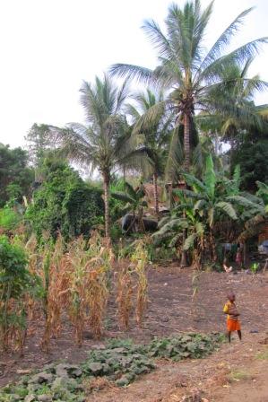 A field of maize with some palm trees.