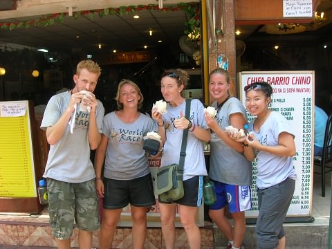 Mmmm.  We ran to the China Town district of Lima, asking directions from the locals the entire way there.  We even had one guy run with us for a short distance to point us down the correct road.  We had to find a shop and buy some sweet rolls before running on to the next place.  The Peruvians are so nice, willing to help us out anywhere we went.  We had people cheering us on, giving us directions, maps and lots of smiles. One guy ran with us to our next destination so we wouldn´t get lost! We might have looked a little strange running through the streets, but we all loved it.