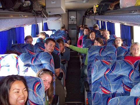 with a huge pile of bags on top! Ya, we´re close! The back of the bus entertained ourselves with camp songs, and got everyone to participate in a few rounds of “Allelu…Praise ye the Lord” – getting some exercise standing up and down when it was our turn to sing! Our first night we stopped at a hostel in