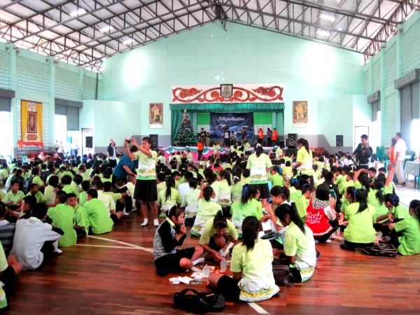 As 6 am rolled around, 13 of us crammed in a car fit for 7 people as we left for our 4 hr ride outside the city.  We came upon first destination and looked inside the huge building to find hundreds of kids sitting on the floor facing the stage. Then came the words that would have once put us in a frenzy, “Alright, you’re up first!” Haha We were ready to rock and roll! We made our way to the stage and performed a skit, and sing our hearts out to a few Thai Christmas songs. Then we prayed for the kids and passed out bibles.