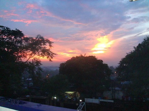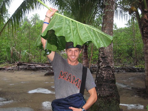 (Using a branch to protect myself from the rain as we went from house to house praying for the sick)