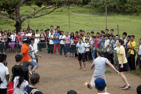 (Challenging the high school students to a game of Sipak Takraw, which is basically a combo between volleyball and hacky sack using a plastic ball)