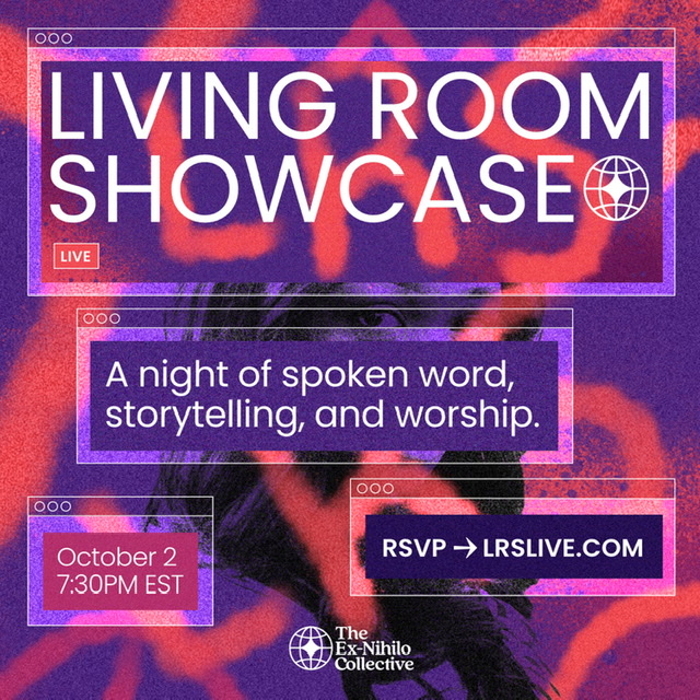 CLICK HERE to be directed to our website to enter your name and email to receive FREE access to The Ex-Nihilo Collective’s Living Room Showcase (LRS) LIVE! You will then be connected to receiving our email updates leading up to this Kingdom-marking night! They will include exclusive content such as interviews with our highlighted artist, discussion questions, and even a familiar face that will be your virtual host leading up to October 2nd 🙂