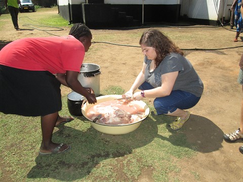 We’ve partnered with two different ministries so far. The first day (Friday), we were with a ministry called Tafara in Sakubve, Mutare. (Sah-koo-vay, Mu-tah-ray).  The moment we walked into the backyard of the compound, I felt at home. The women were preparing the meal for the day, and they let me help them with the chicken.