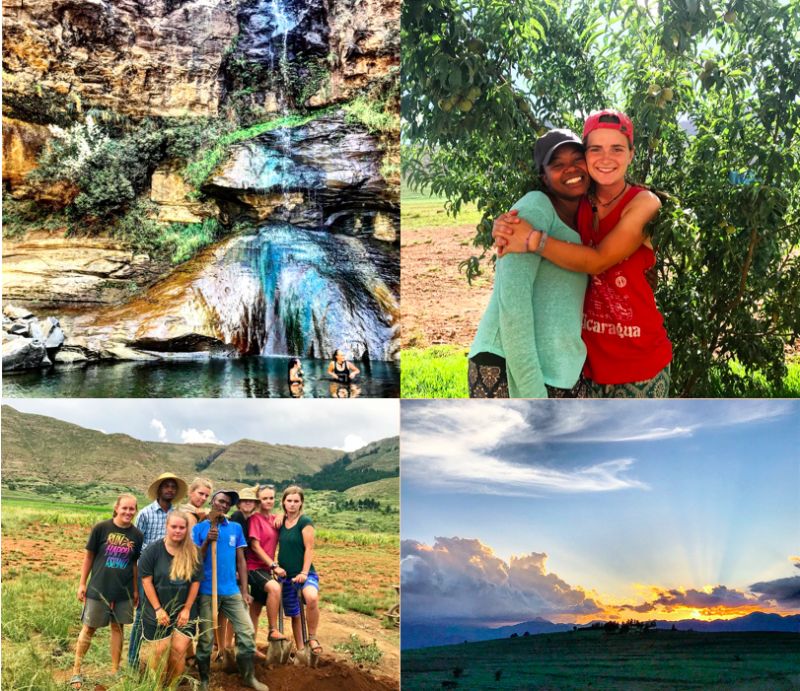 Top left: This was a waterfall we went to. We hiked through mountains and farmlands to get there. Top right: This is Portia. She was our translator for village ministry. She is also Agnes’s granddaughter. She was such a sweet, friendly, charismatic soul. Bottom left: Striking a pose after a hard day of manual labor. Bottom right: The sunrises in Lesotho were gorgeous. Definitely my favorite view to wake up to.