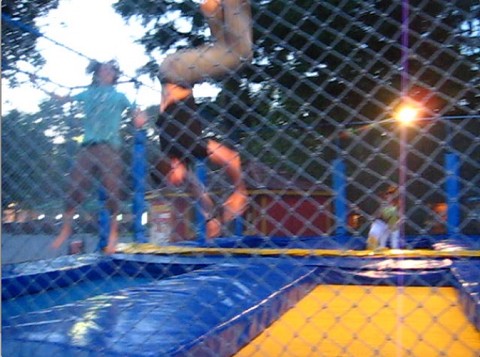from one tramp to the next occasionally hitting the netted wall and bouncing