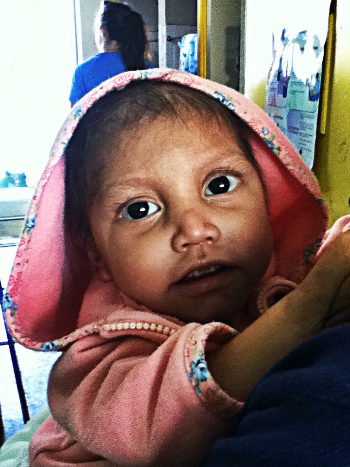 He is three years old, but looks like a 6 month old baby. He can't even sit up yet. When we first started taking care of him, he wasn't the happiest baby. He kept crying and swatting us away every time we tried to touch him.