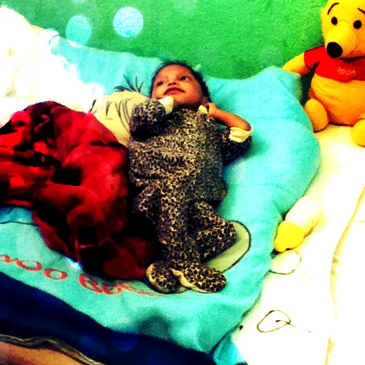 He is three years old, but looks like a 6 month old baby. He can't even sit up yet. When we first started taking care of him, he wasn't the happiest baby. He kept crying and swatting us away every time we tried to touch him.
