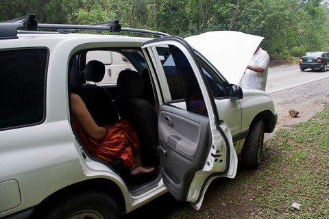 About 30 minutes into this ordeal, Butch finally started! We drove about 1/4 of a mile, and he shut down again. Stuck in the middle of traffic again, everything that we had just experienced was repeated – punching the gas pedal and all mentally praying. Butch finally turned over and we went about another 1/4 of a mile before he cut off again. Luckily this time, we were able to drift off the road a bit before he turned off.