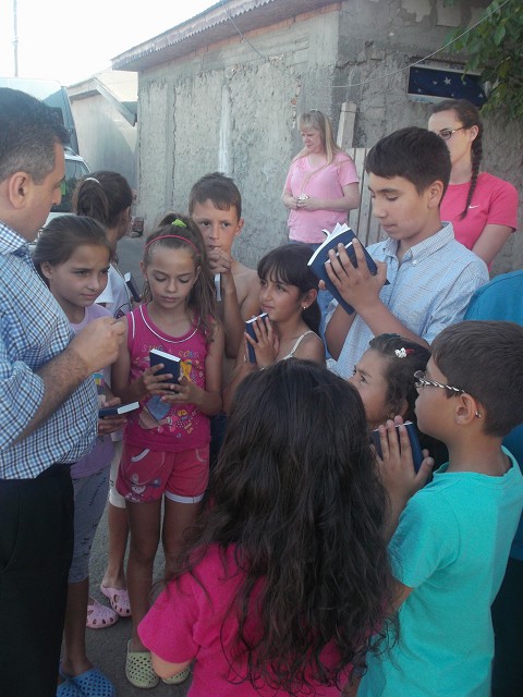 For 2 days, we got to follow Becky and visit four communities! We sang songs and did silly hand motions, they heard about how powerful Jesus is! They heard testimonies from fellow Romanians and then got a piece of candy or an apple! One of the stops we made, we handed out New Testament bibles to the kids and adults!