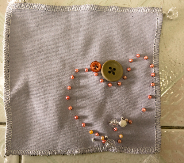 The other day I thought of you – we went to this children’s daycare home for mentally disabled kids. I was helping out in the craft room. The kids were doing a sewing craft. The teacher asked me to teach the girl next to me how to sew a button. She gave me this small square of purple fabric and a few buttons the two of us could choose from. So we started sewing buttons.