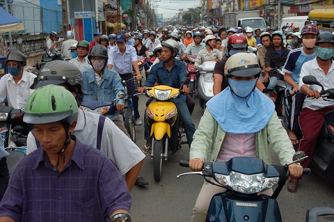 Before describing the rules, we need to take a moment to explain the traffic situation. Or maybe I should say traffic in a non-American sense. Here 1,000’s of short Vietnamese can be seen riding in a sea of mopeds. They’re stinking everywhere! And to top it off they wear brightly colored helmets (my favorite so far is the Panda Bear complete with ears and a tail!) I’m utterly convinced that traffic laws don’t exist in Asia. It is a normal daily occurrence to see a mopedist riding in the opposite direction on a major 5 lane highway. Stopping at a red light is a suggested rather than enforced instruction. I don’t speak Vietnamese, but I think the horns here communicate, “I’m not releasing my foot from the gas pedal-not for anything or anyone!” Sidewalks…Use at your own risk! Sidewalks are actually the Vietnamese solution to all the nation’s traffic congestion. If you are stopped in traffic as a mopedist you have the option to drive on the sidewalk. So, you can understand why Krystle & I now refer to our morning runs as our morning human pinball game. We don’t actually run. Instead, we spend 30 minutes in an intensive agility training-dodging Asian mopedists.