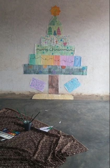 10. Christmas in the village means painting a Christmas tree and taping it to the wall with medical tape. I love our Charlie Brown Christmas tree, though.
