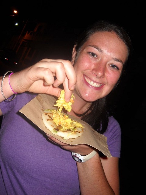 This city does have a lot of perks for World Racers, inculding many fast food chains like Wendys and Burger King, Malls everywhere filled with cool shops, nicer resteraunts including Chili’s, TGIFridays, Tony Romas and more, supermarkets on every corner that are stocked full of coke and peanut butter, and even Pupuserias covering the sidewalks! Don’t know what a Pupuseria is? Well that is a shame. It is a place here where they make a special type of food that are an El Salvadorian classic called Pupusas. These are a corn tortilla that is stuffed with cheese, pork, shrimp or beans. Some places even have this stuff called Laroco which is a yummy green filling in the pupusas. [Don’t comment asking what the green stuff actually is, because I honestly have no idea. I just know that you can only find a Laroco Pupusa in El Salvador and it is very, very tasty.] But the best part about Pupusas is that you eat them with your hands, after you see the woman make it for you on the street right in front of you, and then you only have to pay her 40 CENTS per pupusa! SERIOUSLY! So, 3 pupusas make a great meal and including a can of coke your total will be about $1.70! Man, I love El Salvador.