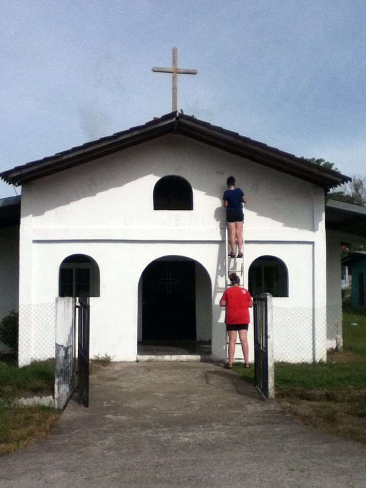 Acting as a “spotter” while they paint letters on a church front.