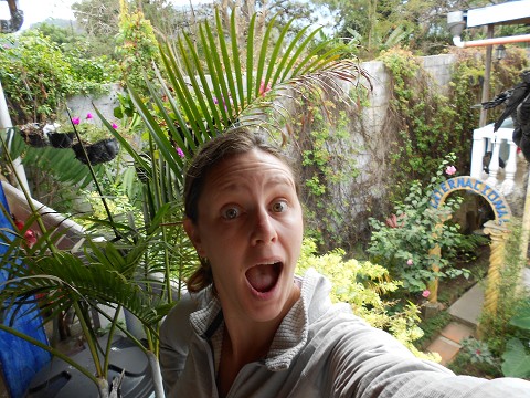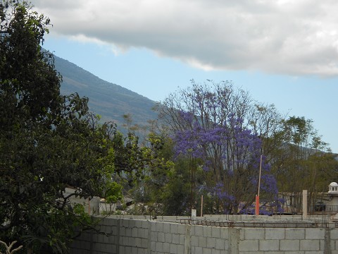 Me in the kitchen, the view from our kitchen. Note the Purple Jacaranda tree and that mountain slope, yup, that's a volcano.