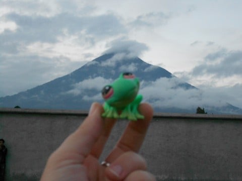 Here is Froggy at 6am, just before sunrise, in front of a volcano.