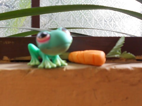 This picture is really for Clara, to celebrate her love for all things little. I found a tiny carrot made out of sugar and stopped to buy it so I could get a pict of Froggy eating a Froggy sized carrot for her.