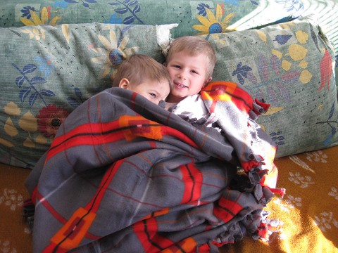Yesterday morning we got to go see them for a short time and tell them goodbye. After we gave them the blanket, the boys played with it the whole time: hiding under it and playing peek-a-boo, covering us with it, dragging it all over the house. We never thought they would love it so much.