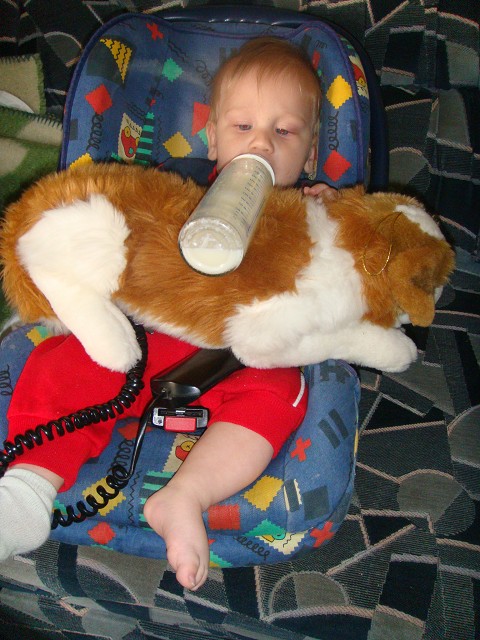Feeding could get quite tiring…the stuffed dog became a very convenient tool to make meal time a little easier. 🙂