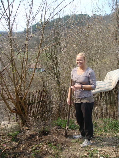 Katie tilling our garden.