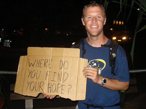 Where do you find your hope? It’s a question that can go as deep as a person wants to take it. It’s a question that can stir a wide range of thoughts and emotions. Asking that question to someone you know well in a safe setting is one thing. Asking that question in Byron Bay where the culture is to surf all day and party all night along with a philosophy of life that “anything goes” is a little trickier. I put that question on a cardboard sign and sat out on a street corner the last two Friday nights. It’s not something I’ve ever done before, but the local ministries here recommended that our team should give it a try.