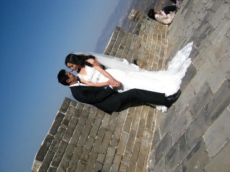 A couple getting wedding photos on the Great Wall. And yes she hiked up there in her dress!