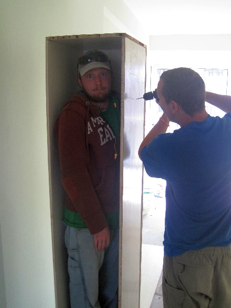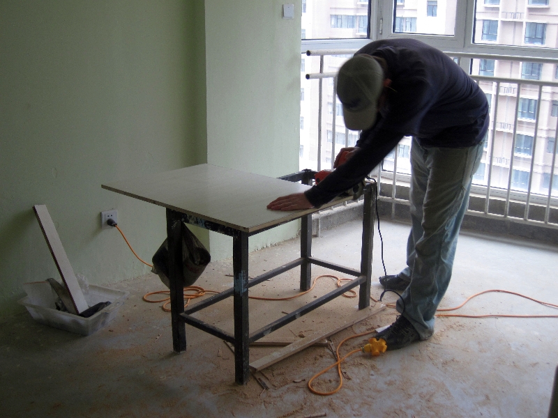 Cutting the big pieces of wood so we can fit them in the elevator instead of carrying them up 10 flights of stairs to the 10th floor