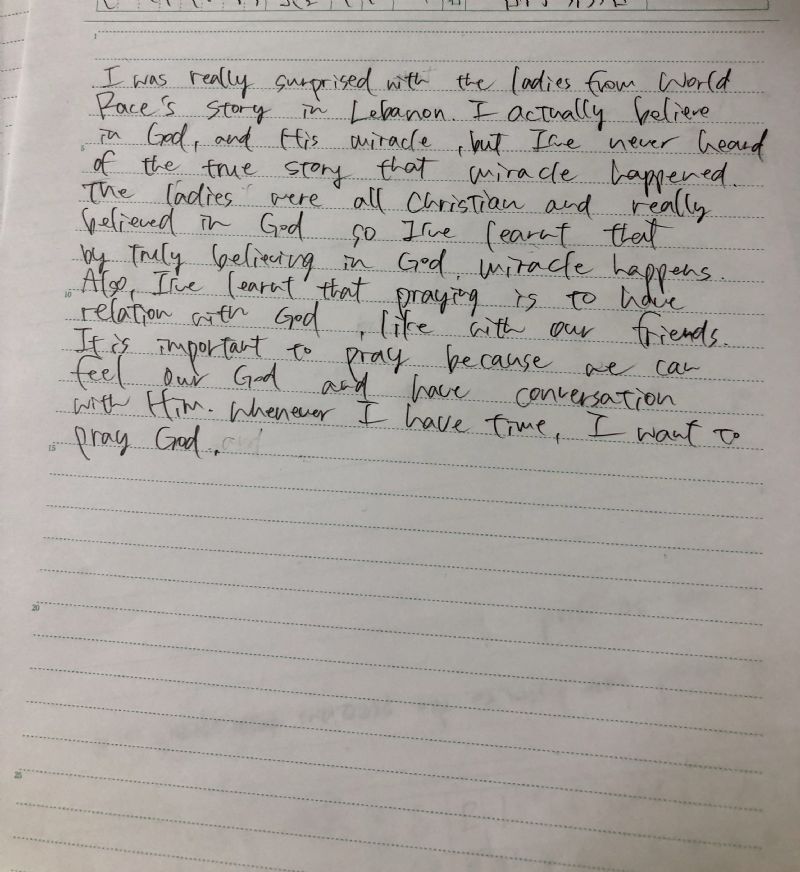 At the end of this particular class, students are required to write a little report about what they learned that day. We read through so many reports about how some of the students loved hearing our stories and had heard about Jesus before, but didn’t realize His power is still real today. Other reports expressed that they wanted to know more about Christianity, and some even wrote that they wanted to try praying. It was really, really powerful.