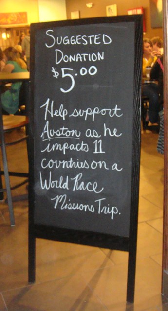 This past weekend I took the opportunity to do a little fundraising back in good ‘ole Missouri! My previous employers (the Roy’s) opened up their shop for “A Night of Music and Coffee,” to support my endeavors on the race. It was a very successful night and could not have been made possible without everyone who showed up to support, the amazing musicians, Jeremiah Gallagher, Paul Pierce, and Lee Ellen, and of course the Roy’s! We were able to raise $1040! This is a testament to how great our God is!