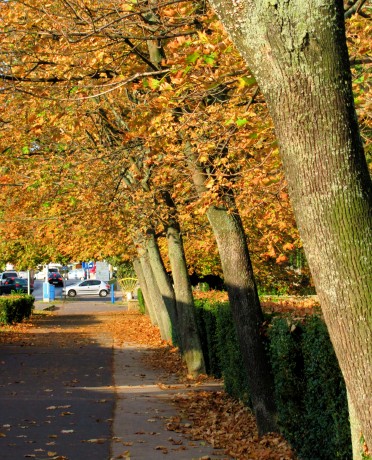 trees with red and orange leaves falling in the fall breeze, I am in awe.