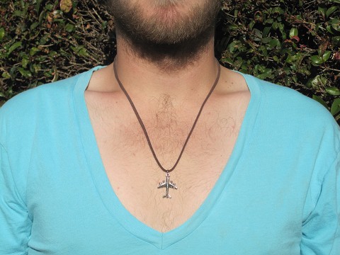 "Fly Away" necklace. $10 – available colors: brown leather cord with silver or gold plane charm; purple leather cord with silver or gold plane charm.