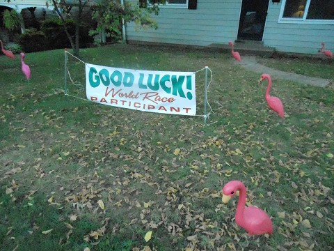 We got back from Indiana yesterday afternoon and I went to have dinner at my Aunt Jeanine’s house and see my dad and his family. When I got back I saw a man in my yard putting up a sign. When I got closer I realized there were flamingos all over my yard with a sign that said “Good Luck World Racer.” The youth group at my church flamingoed my yard! I was so excited to see it. It was such a huge surprise.