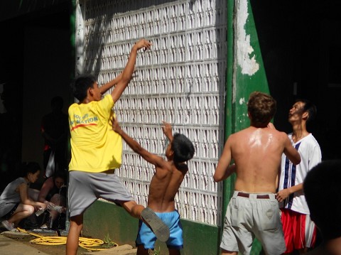 We piled into the back of an old white truck and drove to what seemed to be a back alley near a parking lot and what seemed to be an abandoned building.  As soon as we got out of the truck, little children flocked to us, asking to be held and played with.  Almost all of them were barefoot, and they wore tattered clothes that reeked of urine and sweat.  We played with them, prayed for them, and gave them food, water, and to some, new tee shirts.  It was saddening to think that as we would go home to our comparatively comfortable ministry base to sleep in real beds, or at least mattresses, these children—due to no fault of their own—would settle their heads on concrete or cardboard, and fall asleep next to some closed shop or under a tin overhang.
