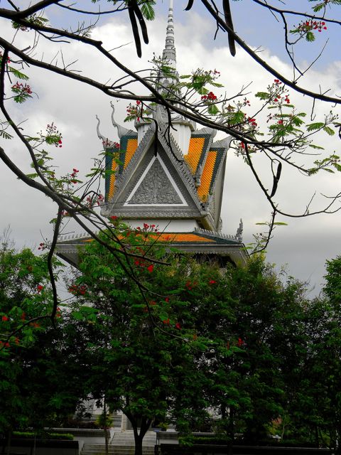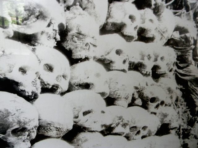 A temple that was built at the killing fields. It holds the remains of the bodies found in the fields.