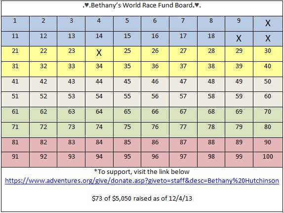 My newest fundraiser is a “Fund Board.” Choose the dollar amount you’d like to donate, from the table below, and it will be marked off. The goal is to get the entire board filled, which will total an incredible amount of $5,050. I’ll consider your donation my World Race Christmas gift 🙂 Please help me out. I need about $800 more by December 18th and then another $9,000 after that.