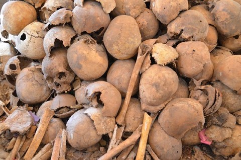 Our first day here we were able to take a tour of the city. Pakva, one of the YDC staff members, took us to Boy Mountain and Girl Mountain, the site of temples that had been built over killing fields from Cambodia's mass genocide at the hands of Pol Pot and the Khmer Rouge in the 1970s. On display in one of the temples was this pile of children's skulls, and there were also a couple of mass graves you could still see.