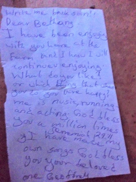 The children living here at the Challenge Farm have touched my heart. I look around during class and almost can't believe that most of them were living on the streets only a short time ago. They are so calm and kind and smart and such an inspiration. Geoffrey is one of my favorite students. Yesterday he passed me a sweet note.