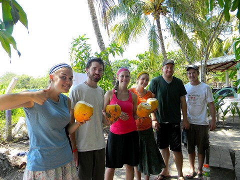 This week we were blessed with the opportunity to visit a rural community about 45 minutes outside of San Vicente. Our friend Carlita's parents run a church there so we camped in their backyard (with the cows, chickens and pigs), performed skits at a school, played soccer and worshipped with them for several hours a night. It was nice to get away but I think we all realized how lucky we are to have such nice accommodations here in San Vicente when we were without Internet, beds, toilets you can sit on and a shower for the past few days. In exchange for all that we had some "luxuries" of our own, such as drinking fresh coconut juice, long games of Phase 10 all crowded in one tent to avoid mosquitos, witnessing a handful of people accept Jesus, and gazing at the most beautiful stars I've ever seen.