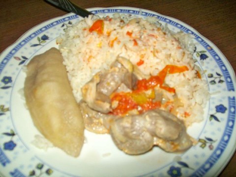 Anchovie curry, boiled unripe plantains and chicken claw stew.