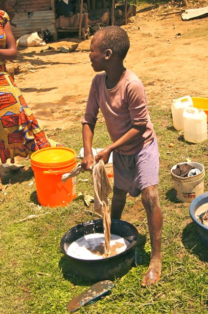 Families in this area of Africa usually live with many people sleeping in each room of any given home. Homes can be made of mud bricks or, for the wealthier people, cinderblocks and cement floors. Single families often have one room for sleeping and one room for living in, while multi-room homes usually have several families living in them. The wife in a family is usually primarily responsible for cooking and cleaning constantly, while her husband earns the income. Children are expected to help with chores from an early age, and the chores are usually quite intense! Children are often seen washing clothes by hand or hauling huge buckets of water on their heads from the community well or stream. To supplement the income, women will often carry huge tubs of fruit on their heads and sell at the local market, while others work as tailors. Another common job in Africa is to be a “house girl”, which is when somewhat wealthier families hire a local young woman to handle household chores.
