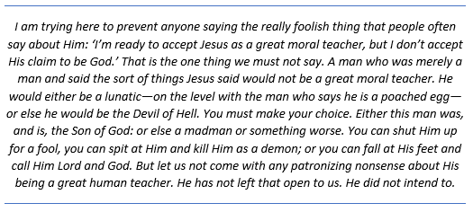 So, if one were to claim that Jesus was not the Son of God—fine, that is their opinion (although I do not agree, and I would love to chat with said person). However, that same person cannot, in their right mind, also claim that Jesus was a teacher of morals to look up to, for either he was lying or out of his mind. Either way, neither is a sound basis for someone to claim to follow moral teachings from another.