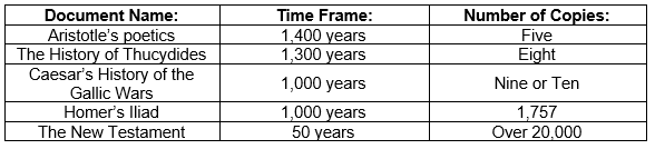 Here is a comparison chart of trusted and accepted historical documents, their time frames between originals and the known copies, and the known number of copies.