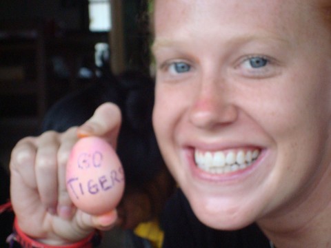 Kristen with her “Blinkvah” egg…the name we have My GO TIGERS! egg in remembrance of many a Easters