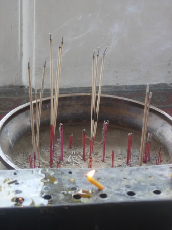 Small statues run along the perimeter of the courtyard. “What are these?” They’re depictions of the many different Chinese gods. Somewhere in the distance there is the faint hum of men chanting. The aroma of incense fills my nostrils and the candle wax runs down.