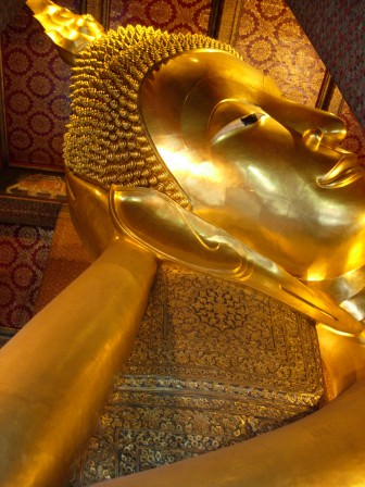 The main feature of Wat Po is the 46 meter long reclining Buddha, which depicts the Buddha passing into nirvana. The soles of the feet are adorned with the 108 auspicious attributes of the Buddha in mother-of-pearl inlay.