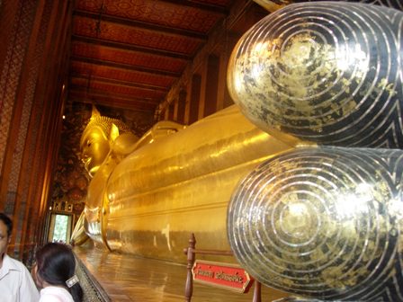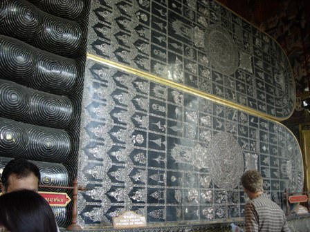 The main feature of Wat Po is the 46 meter long reclining Buddha, which depicts the Buddha passing into nirvana. The soles of the feet are adorned with the 108 auspicious attributes of the Buddha in mother-of-pearl inlay.